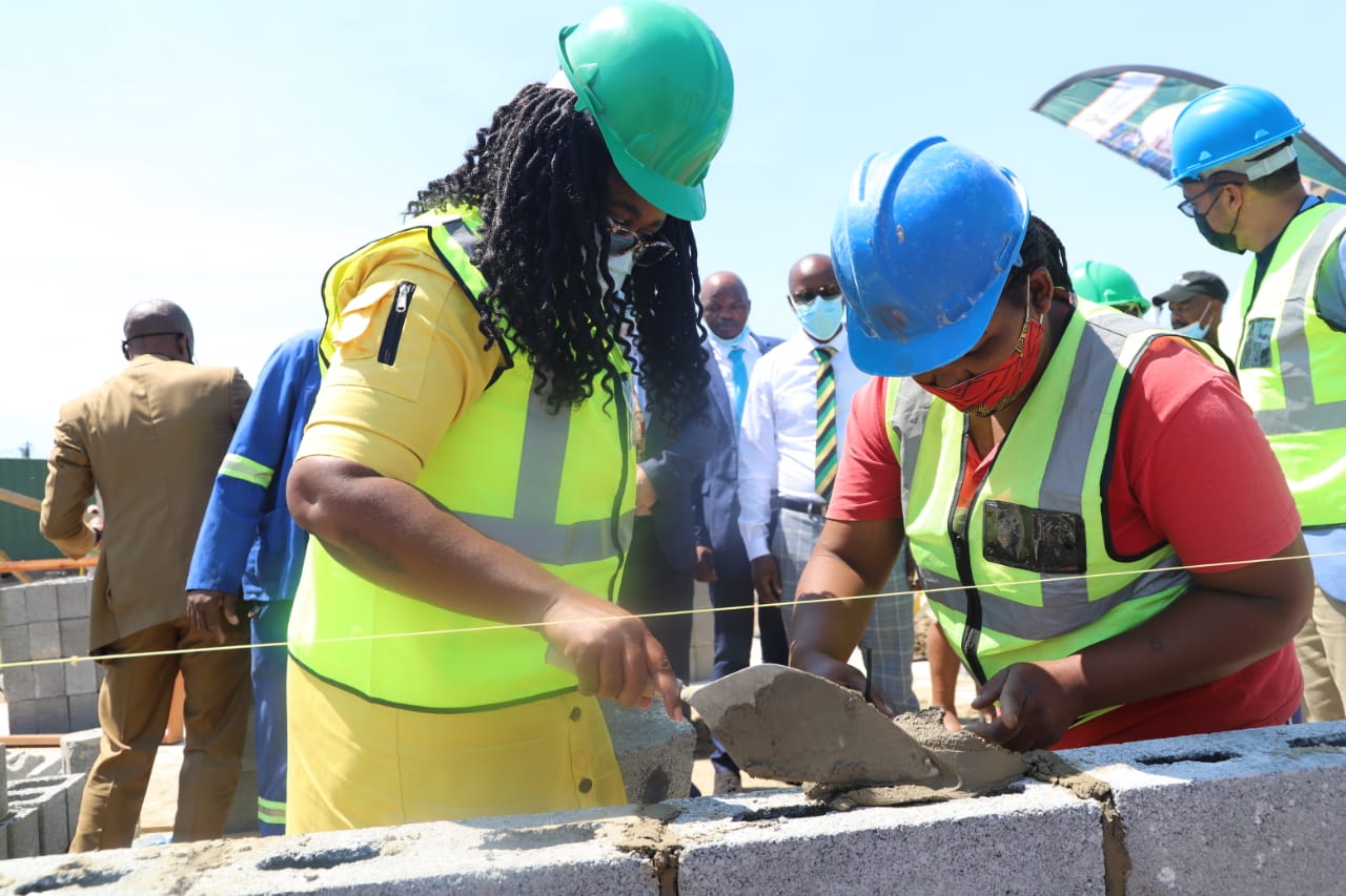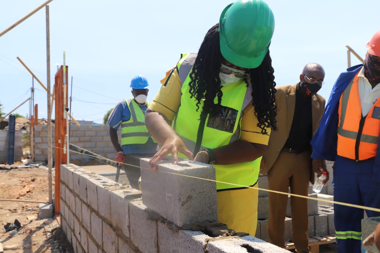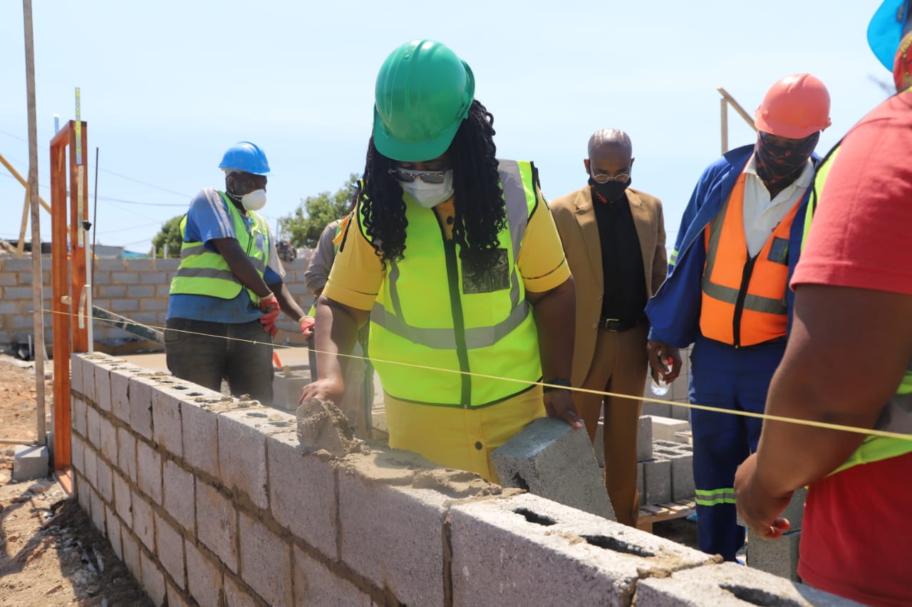 NDoHS Minister Mmamoloko Kubayi, Deputy Minister Pam Tshwete and MEC of HS Tertuis Simmers doing a brick laying with a Woman Sub-Contractor under the project leadership of Mr. Charl Louw, PICTURES