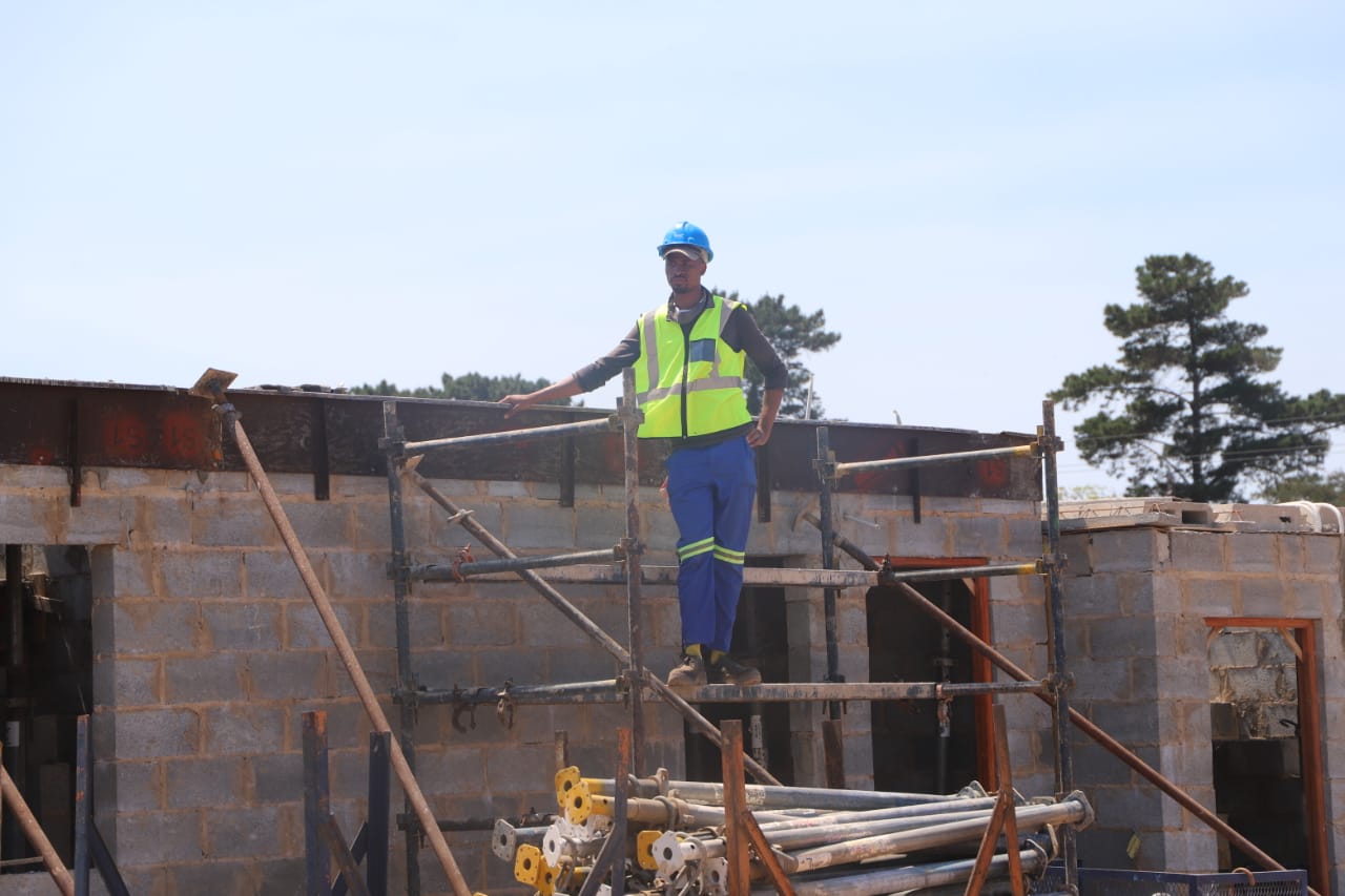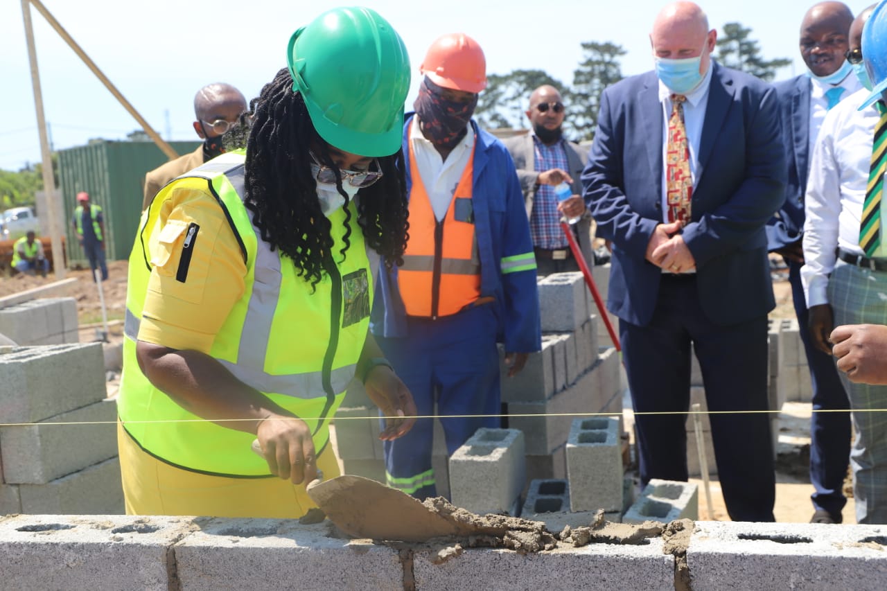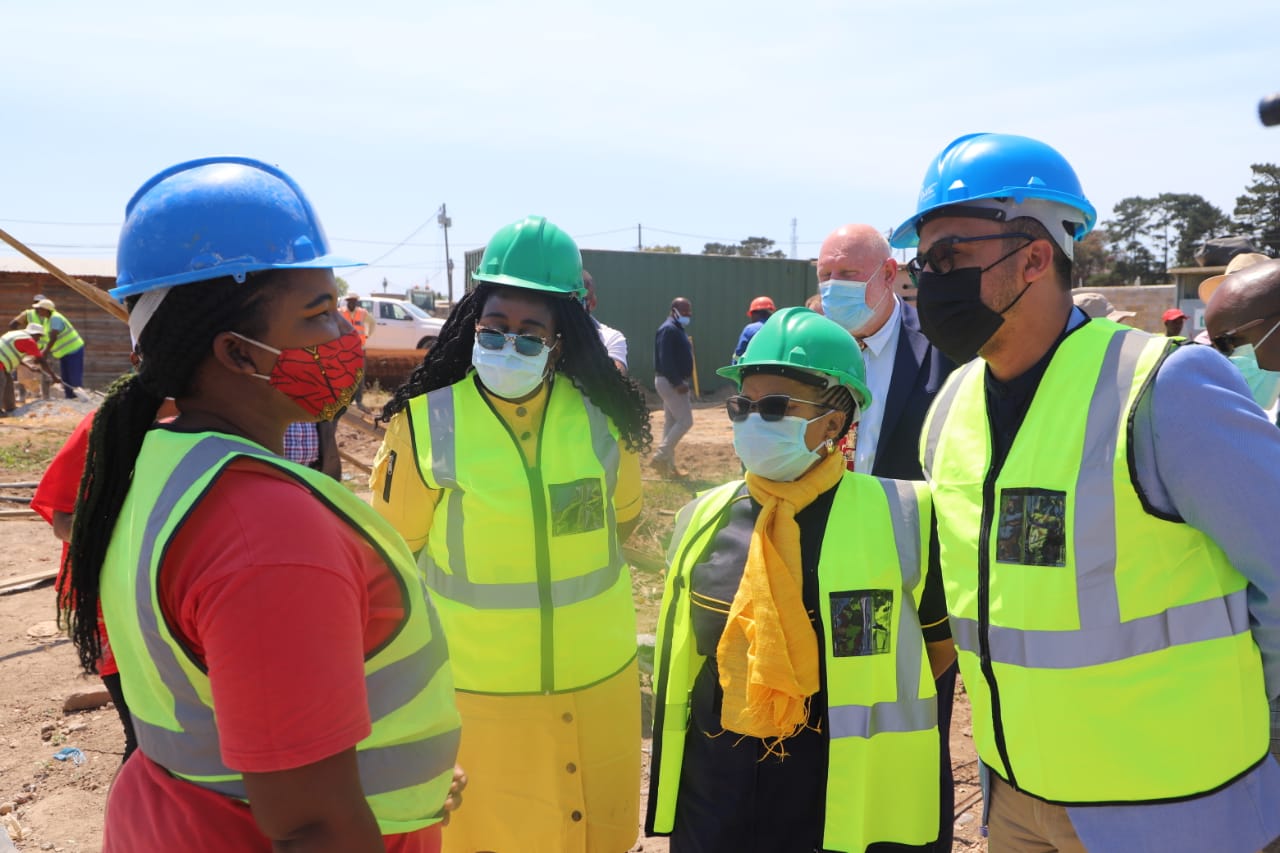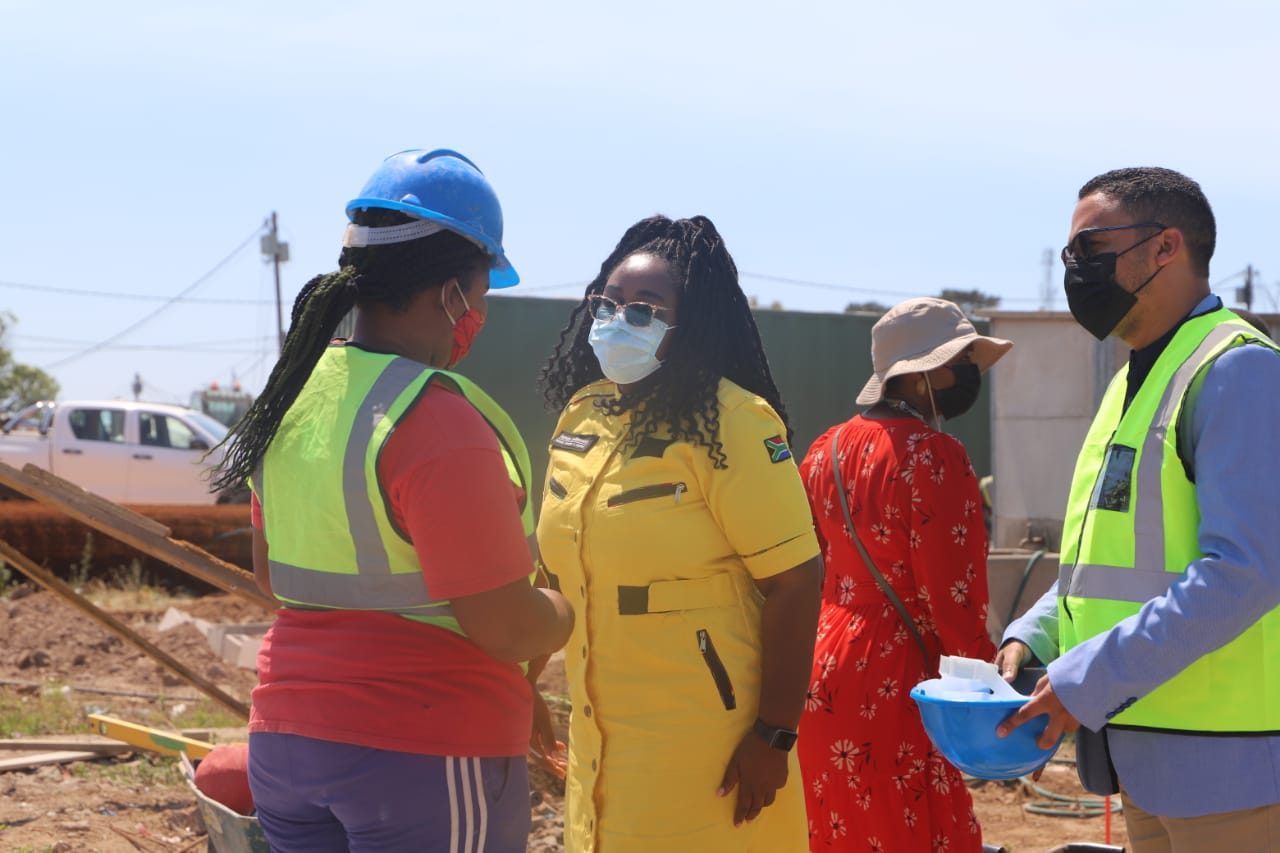 NDoHS Minister Mmamoloko Kubayi, Deputy Minister Pam Tshwete and MEC of HS Tertuis Simmers doing a brick laying with a Woman Sub-Contractor under the project leadership of Mr. Charl Louw, PICTURES