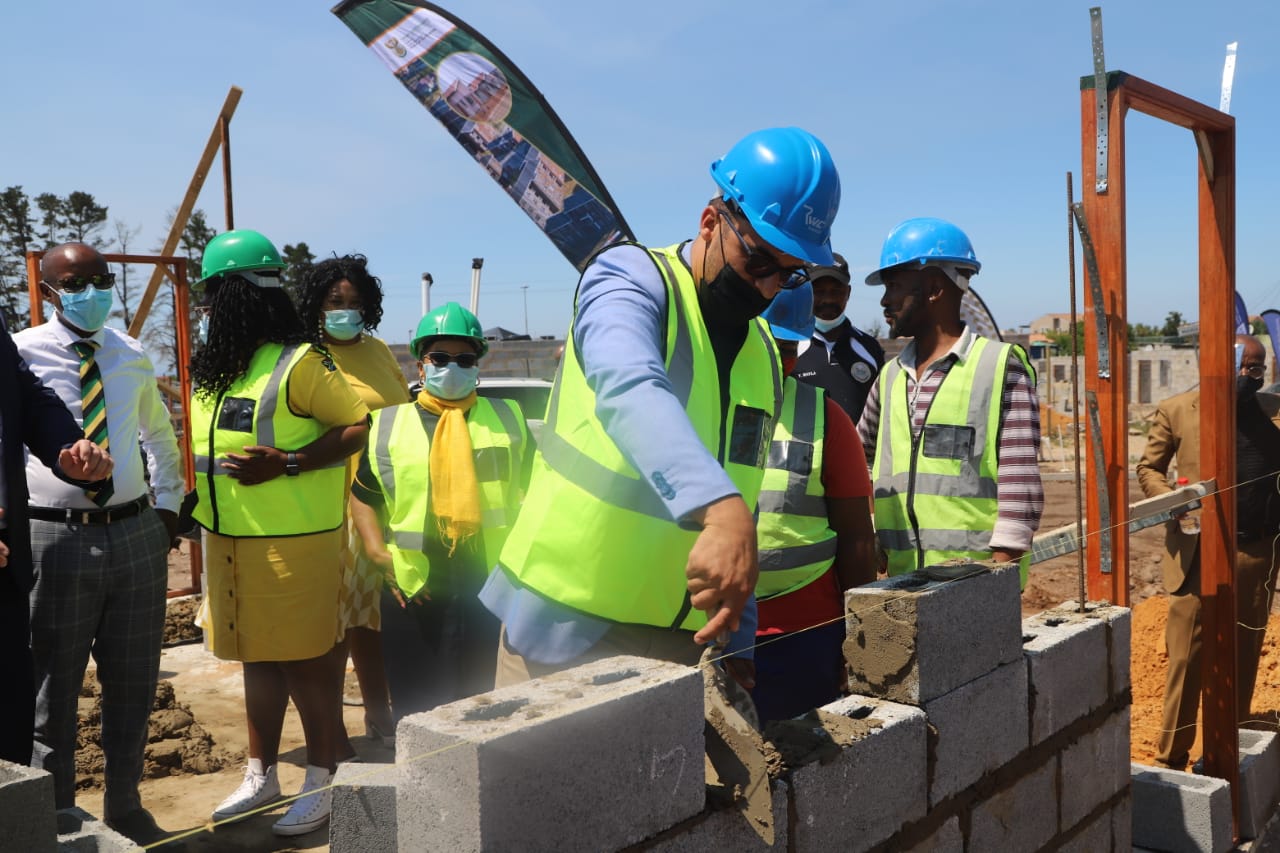 NDoHS Minister Mmamoloko Kubayi, Deputy Minister Pam Tshwete and MEC of HS Tertuis Simmers doing a brick laying with a Woman Sub-Contractor under the project leadership of Mr. Charl Louw,