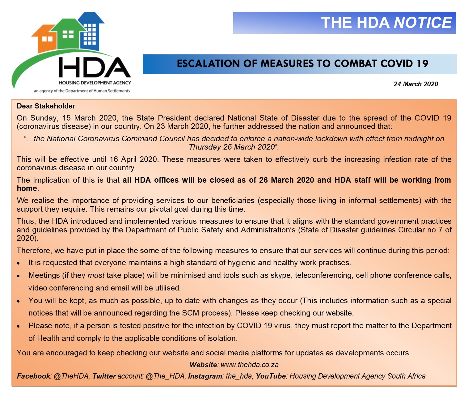 The implication of this is that all HDA offices will be closed as of 26 March 2020 and HDA staff will be working from home.