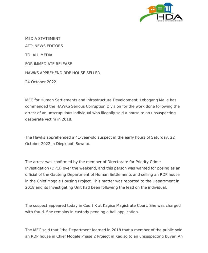 HAWKS APPREHEND RDP HOUSE SELLER