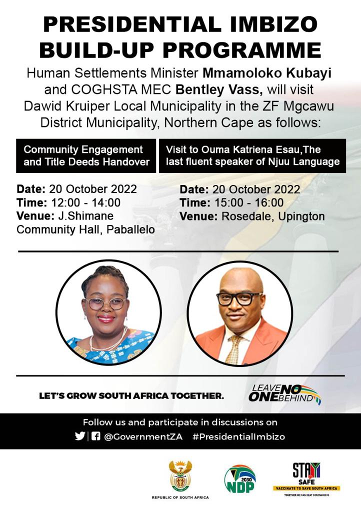 Human Settlement Minister Mmamoloko Kubayi and COGHSTA MEC Bentley Vass, will visit Dawid Kruiper Local Municipality in the ZF Mgcawu District Municipality, Northern Cape