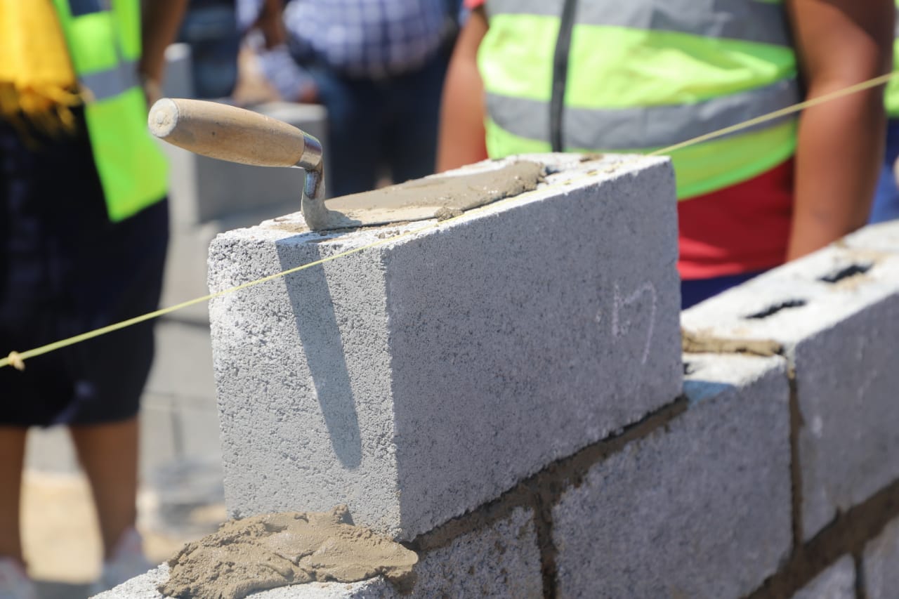 NDoHS Minister Mmamoloko Kubayi, Deputy Minister Pam Tshwete and MEC of HS Tertuis Simmers doing a brick laying with a Woman Sub-Contractor under the project leadership of Mr. Charl Louw,
